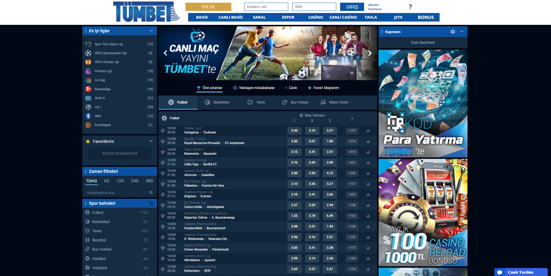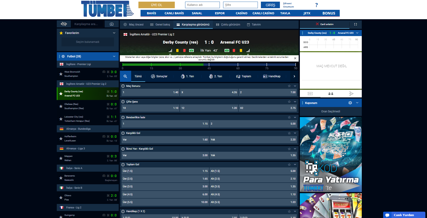 Canlı bahis sayfasından ise futbol, basketbol, tenis, beyzbol, buz hokeyi, hentbol, voleybol, futsal, snooker, masa tenisi, plaj voleybolu spor dallarına bahis seçenekleri açan Tümbet’te müsabakaları takip ederken bahisler yapabilmeniz için canlı maç izleme özelliği bulunuyor. Tümbet’te canlı maç izlemek için izlemek istediğiniz müsabakanın üstüne tıklayarak maç izleme seçeneğine tıklayıp müsabakaları ücretsiz olarak izleyebilirsiniz.