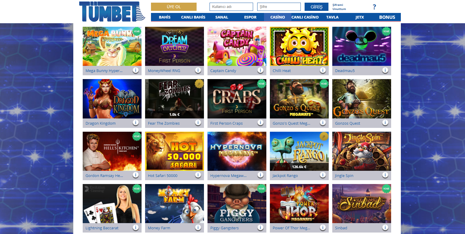 Spor bahisleri alanında iki tane servis sağlayıcı ile hizmetler veren Tümbet casino ve canlı casino alanlarında da hassa davranmış en iy oyun sağlayıcılarını kullanarak oyunlarda hata ve kesinti ihitmmalini sıfıra indirmiştir. Casino alanında kazı kazan, jackpot, sanal oyunlar, video poker ve video slot türlerinde oyunlar oynayabileceğiniz Tümbet casinoda en bilinen oyunlardan tutunda en yeni oyunlara kadar tüm oyun çeşitleri bulunur.